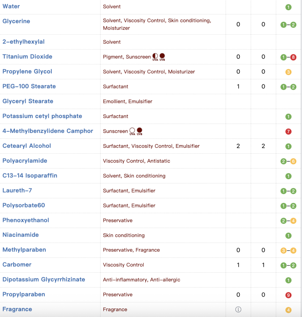 I tak – być może jest to krem z filtrem. Trudno ocenić przed zakupem, bo znalezienie INCI graniczy z cudem – nie ma go na stronie sklepu, który w Polsce go wprowadza do obrotu, nie ma go W OGÓLE na stronie producenta, ale w internecie jest bardzo mało rzeczy, których nie da się znaleźć. Ktoś wrzucił skład tego preparatu (nie wiem, czy określenie „krem z filtrem” tutaj pasuje) na CosDNA.