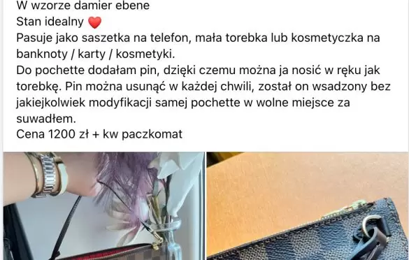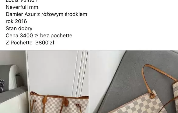 Kiedy pisałam o zjawisku sprzedaży saszetek Louis Vuitton niecały rok temu, ceny wahały się w granicach kilkuset złotych. W tej chwili jest drożej – na jednej z grup sprzedażowych znalazłam ogłoszenie z saszetką Damier Ebene za 1200 zł. Na innej grupie znalazłam ofertę sprzedaży torebki Neverfull Damier Azur. Jeśli bez saszetki, 3400 zł (to moim zdaniem dobra cena, nawet jeśli torebkę trzeba byłoby oddać do czyszczenia). Z saszetką – 3800 zł (przy czym nie oznacza to, że sama saszetka kosztowałaby zaledwie 400 zł).