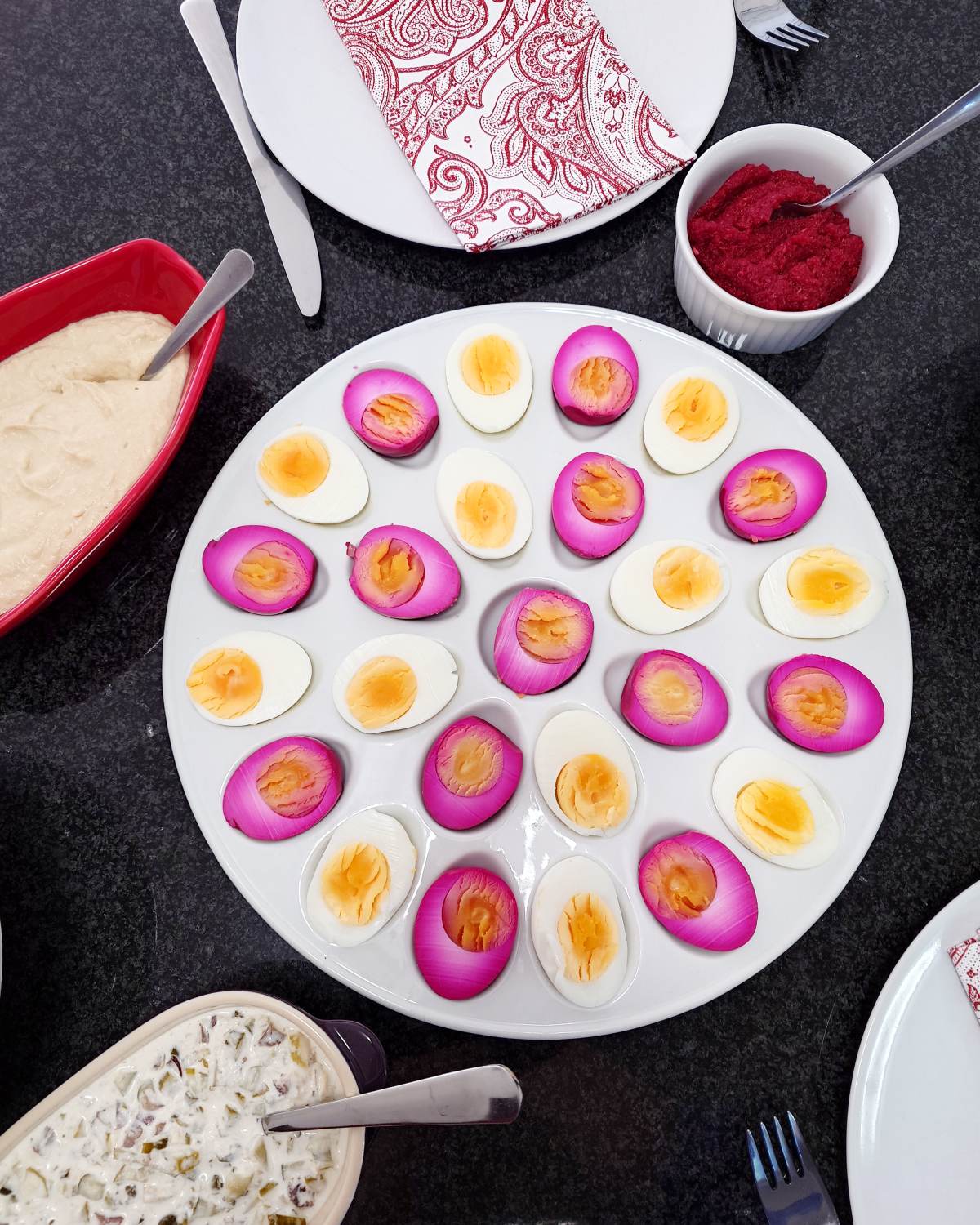Najpopularniejsze są teraz marynowane jajka do ramenu, takie z płynnym żółtkiem, ale ja dziś nie o tym. Nie robię w domu ramenu – nie mówię, że nigdy, bo może kiedyś spróbuję, ale marynowane jajka w buraczkach to przepis nie tylko na Wielkanoc. Jajka gotowane na twardo to doskonała przekąska imprezowa, a w tym kolorze będą OK, jeśli zapragniesz robić imprezę w kolorze różowym. To świetna alternatywa dla tradycyjnych jajek w majonezie, bo kwasowość zalewy idealnie kontrastuje z tłustym sosem tatarskim.