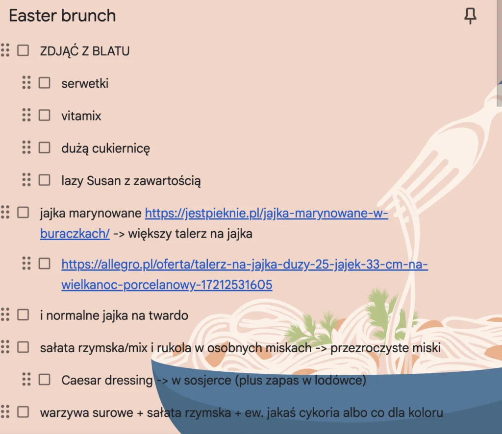 Swoje notatki zwykle robię w Google Keep – mam je zawsze pod ręką. Finalnie zrezygnowałam z nadmiaru dań, stawiając na jakość. Na przykład, zamiast kilku rodzajów jajek, podałam klasyczne oraz moje ulubione jajka marynowane w buraczkach.