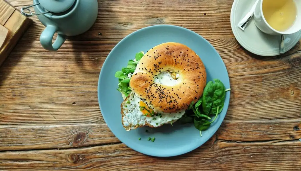 Menu śniadaniowe jest długie – owsianki, jaglanki, jakieś placki na słodko, dwa warianty szakszuki, śląskie kanapki i dwa warianty „śniadania śląskiego”: mięsny i wege. Marek wybrał wariant mięsny. Ja chciałam wariant wege, ale z hummusem (też dostępnym w karcie) zamiast dżemu i miodu. Niestety, okazało się, że nie ma takiej możliwości, bo hummus jest podawany od 12.00. Wzięłam więc bajgla z twarożkiem, jajkiem sadzonym, rukolą, awokado i gravlaksem. Do tego herbata sypana – pani proponowała co prawda mieszankę herbaty białej i zielonej z aromatem winogron, ale wybraliśmy czarną.
