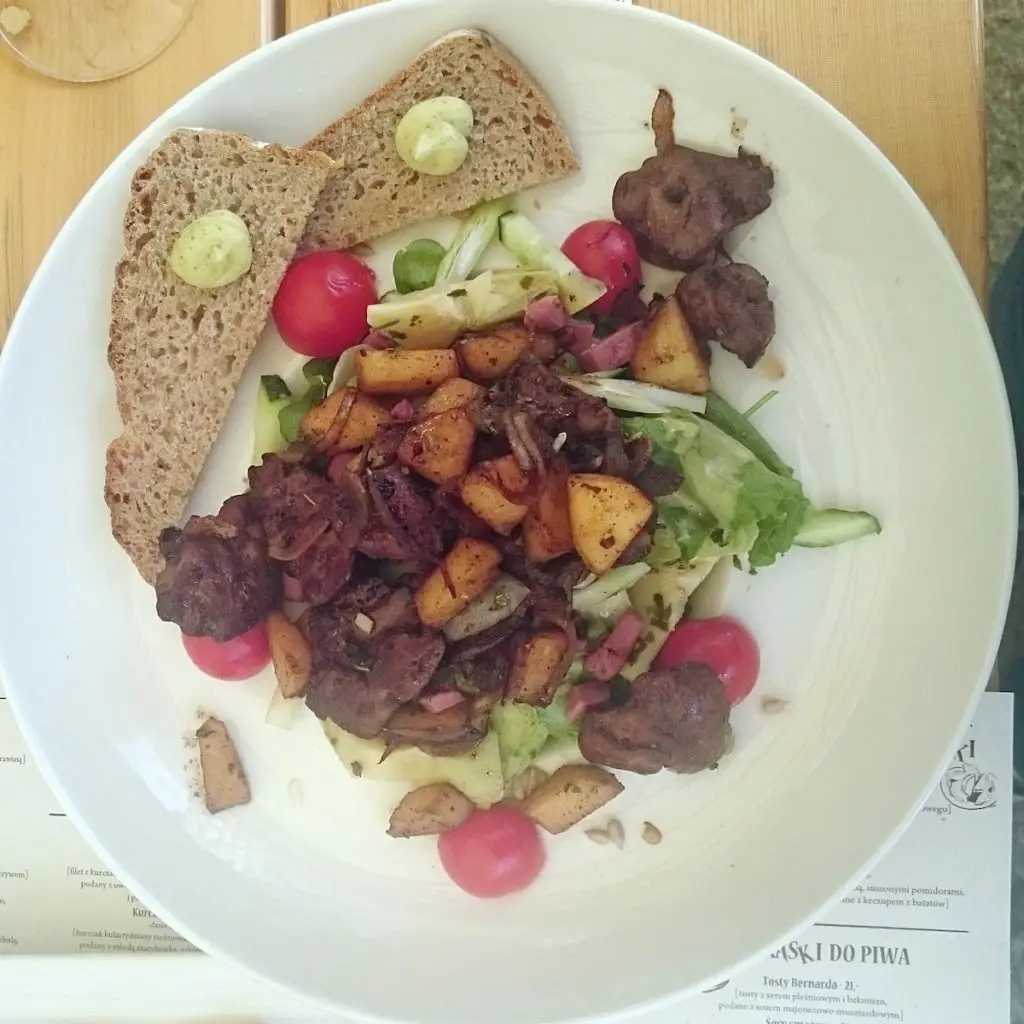 Na obiadokolację umówiliśmy się ze znajomą. Padło na restaurację Bernard. O ile piwo jest naprawdę OK, o tyle jedzenie nie zasługuje na większe pochwały. Owszem, przekąski typowo barowe, czyli krążki cebulowe, pikantne kawałki kurczaka czy frytki są OK, o tyle sałatka cesarska Marka była przeciętna, a moja sałatka z wątróbką – nietrafiona. Niestety, zestawienie duszonej w śliwowicy wątróbki i kawałków duszonego jabłka z sałatą, ogórkami, selerem naciowym i sosem ziołowym było słabe. W głowie podzieliłam to sobie na dwa osobne dania, zjadłam część warzyw i wątróbkę, ale więcej do Bernarda raczej nie będę zaglądać. Być może wybranie sałatki w czeskiej restauracji nie jest mądrym pomysłem, ale z drugiej strony – jeśli jest w karcie, to dlaczego nie?