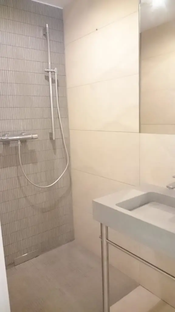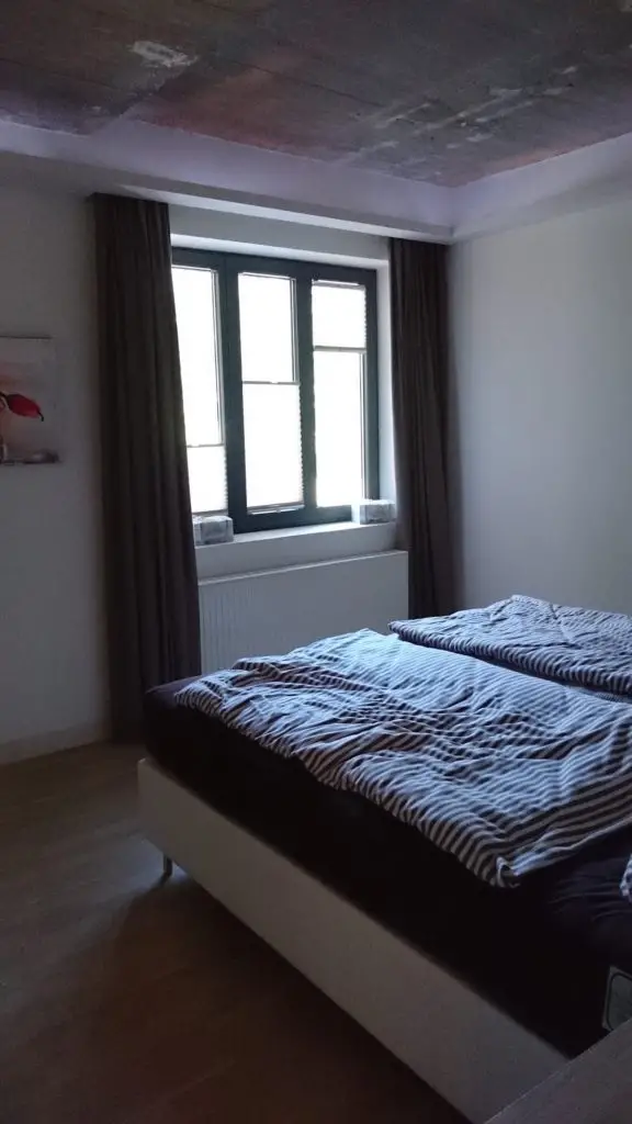 Okazało się jednak, że Prora się zmienia – na lepsze, moim zdaniem. Część budynków jest w trakcie remontu – powstają tam mieszkania, docelowo ma też być hotel. W niektórych nic się nie dzieje, a co najmniej jeden jest czymś w rodzaju squatu. Mnie się włączyła praworządność, ale Marek zrobił sobie spacer i mówi, że wewnątrz nie wygląda to źle. Całkowicie legalnie zwiedziliśmy za to apartament pokazowy – widać go na zdjęciach. Zamiast jednego pokoju i łazienki po przeciwnej stronie korytarza, jak to miało wyglądać w pierwotnych planach, mamy mieszkania dwu- lub trzypokojowe, a także dwupoziomowe apartamenty. Nowocześnie, neutralnie, ale z detalami wskazującymi na to, że to nie jest generyczny blok gdzieś tam – spójrzcie na zdjęcia sufitu.